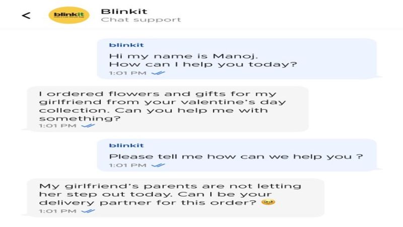दरअसल ट्विटर पर Blinkit के अकाउंट द्वारा एक कस्टमर और मनोज नाम के डिलीवरी एग्जीक्यूटिव की चैट शेयर किया जिसमें शख्स वैलेंटाइन डे के मौके पर कुछ मदद मांग रहा था जिसे कंपनी के सीईओ अल्बिंदर ने पोस्ट करते हुए कैप्शन में लिखा India is not for beginners दरअसल ये पूरा मामला वैलेंटाइन डे को लेकर था जिसमे बॉयफ्रेंड ने ब्लिंकिट डिलीवरी एप पर कस्टमर हेल्प केयर में चैट करते हुए कहा की 'मैंने आपके वैलेंटाइन कलेक्शन से अपनी गर्लफ्रेंड के लिए कुछ फूल और गिफ्ट ऑर्डर किए हैं। क्या आप इसमें मेरी कुछ मदद कर सकते हैं।कस्टमर केयर से मनोज पूछते है "कृपया बताएं हम आपकी कैसे मदद कर सकते हैं " इसपर BF ने लिखा- 'आज के दिन मेरी गर्लफ्रेंड के पेरेंट्स उसे घर से बाहर नहीं निकलने दे रहे। क्या में इस आर्डर के लिए आपका डिलीवरी पार्टनर बन सकता हूं?' जवाब में ब्लिंकिट ने अपने ट्विटर पर चैट का स्क्रीनशॉट शेयर कर लिखा- नहीं हम ऐसा नहीं कर सकते