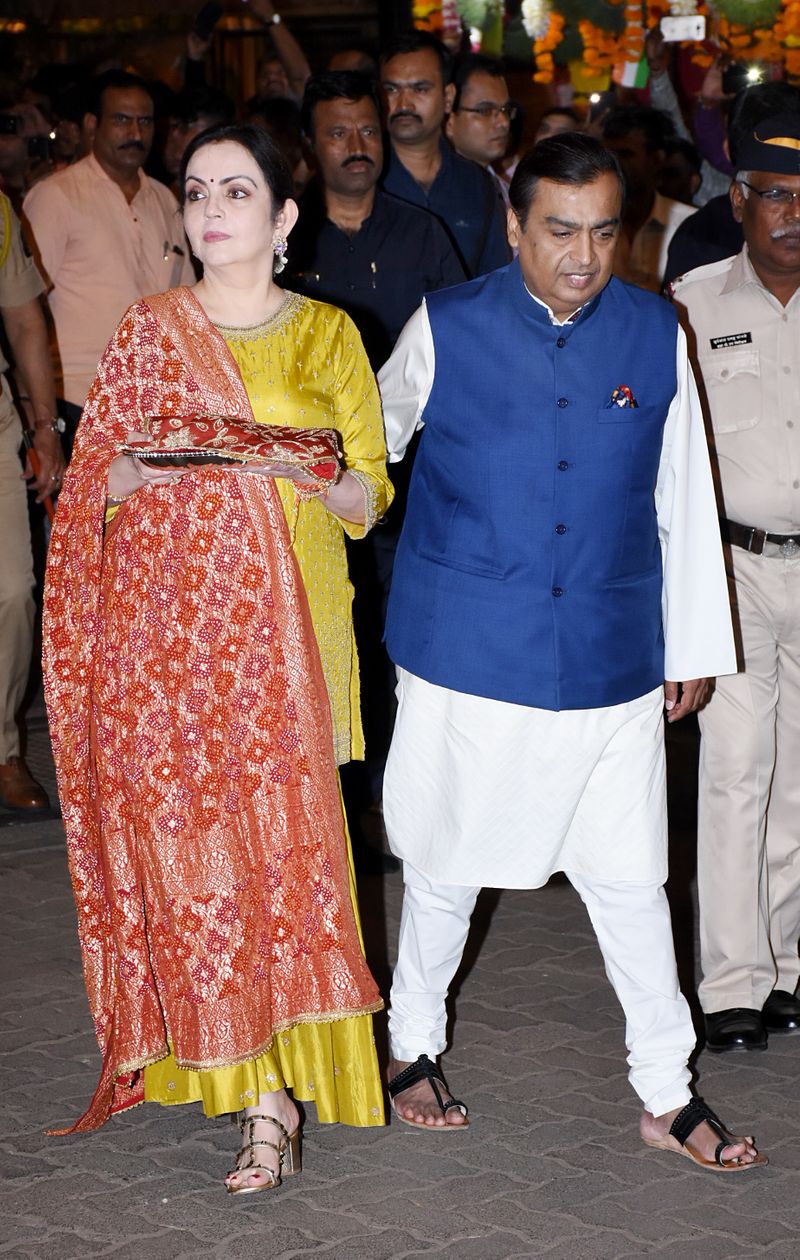 सिद्धिविनायक मंदिर में नीता अंबानी हाथों में पूजा की थाली लिए परिवार के साथ भगवान के दर्शन करने पहुंची। यहां पर नीता अंबानी पारंपरिक परिधान में नजर आईं उन्होंने पीले रंग की ड्रेस और रेड कलर का दुपट्टा पहना हुआ था।