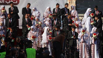 मलबे से भरी जमीन पर बिछी लाल कालीन पर, दर्जनों जोड़े ढोल की थाप पर चलते हुए एक अस्थायी मंच पर चढ़े। कढ़ाई वाली ड्रेस पहनी दुल्हनों ने फिलिस्तीनी रंगों - लाल, सफेद और हरे - वाले गुलदस्ते पकड़े हुए थे। दूल्हे उनके बगल में छोटे-छोटे झंडे लहराते हुए चल रहे थे।