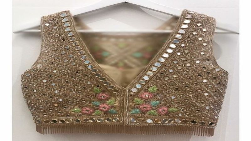 गोल्डन ब्लाउज किसी भी साड़ी के साथ आसानी से मैच कर जाता है। प्लेन साड़ी, फ्लोरल साड़ी, एंब्रायडर्ड साड़ी, कोई भी साड़ी गोल्डन ब्लाउज के साथ ऑटोमेटेकली सुंदर लगने लगती है। अब इस ब्लाउज को देखिए जिस पर मिरर वर्क है और थ्रेड की कढ़ाई है। इस ब्लाउज को आप किसी भी साड़ी के साथ पहनती हैं आपकी साड़ी खूबसूरत लगने लगेगी। ब्लाउज की कढ़ाई साड़ी के लुक में रॉयल्टी क्रिएट करेगी। ये ब्लाउज आप प्लेन लहंगे पर भी पहनेंगी तो लहंगे का लुक बदल जाएगा।