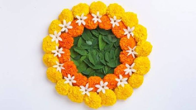 अगर आपने पहले कभी रंगों से रंगोली नहीं बनाई है तो आप आम के पत्तों और फूलों से खूबसूरत रंगोली सजा सकती हैं। इसके लिए आपको सफेद फूलों, आम के पत्तों और पीले गेंदे के फूल की जरूरत पड़ेगी।