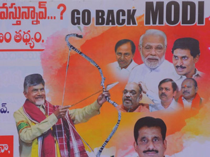 प्रधानमंत्री नरेंद्र मोदी की रैली से पहले आंध्र प्रदेश के कई शहर मोदी विरोधी पोस्टरों से पटे हुए हैं। कुछ पोस्टरों में लिखा #नो मोर मोदी, #मोदी इज ए मिस्टेक और मोदी नेवर अगेन...। एक पोस्टर में तो आंध्र के मुख्यमंत्री चंद्रबाबू नायडू पीएम मोदी और अन्य नेताओं पर तीर-धनुष से निशाना साध रहे हैं। तेलुगू देशम पार्टी (टीडीपी) के एनडीए से निकलने के बाद राज्य में यह प्रधानमंत्री नरेंद्र मोदी की पहली यात्रा है।