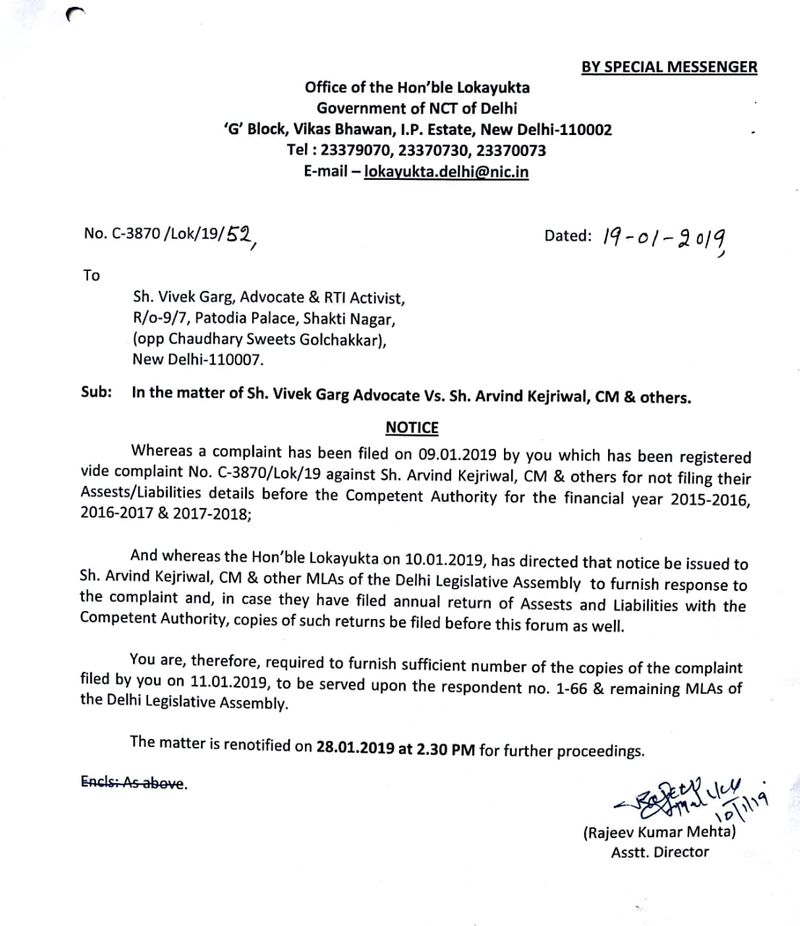इस बारे में दिल्ली के वकील और आरटीआई एक्टिविस्ट विवेक गर्ग ने दिल्ली विधानसभा और सरकार में कई आरटीआई के जरिए केजरीवाल और उसके मंत्रियों और विधायकों की संपत्तियों का ब्यौरा मांगा. तो चौकाने वाला खुलासा हुआ कि दिल्ली सरकार के किसी भी मंत्री और विधायकों ने अपनी सम्पत्ति की घोषणा नहीं की है, बल्कि गैरकानूनी तरीके से दबा रखी है. इस बारे में विवेक ने 9-1-2019 को इस बाबत दिल्ली के लोकायुक्त में एक शिकायत दर्ज करवाई तो मामले की गम्भीरता और कानूनी प्रावधान को ध्यान में रख कर लोकायुक्त ने केजरीवाल समेत दिल्ली के सभी विधायकों को नोटिस का आदेश जारी करते हुए उनकी संपत्ति की जानकारी मांगी है. इसके लिए लोकायुक्त ने 28-01-2019 तक अपना जबाव देने का आदेश दिया है.