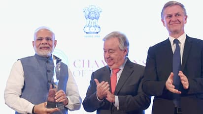 मोदी ने कहा, ‘हम भारत में सबका साथ, सबका विकास के मंत्र पर काम करते हैं और इसमें प्रकृति भी शामिल है।’मोदी और फ्रांस के राष्ट्रपति एमैनुएल मैक्रों को अंतरराष्ट्रीय सौर गठबंधन की पैरवी करने के लिए अग्रणी कार्यों तथा पर्यावरण कार्रवाई के लिये सहयोग के नए क्षेत्रों को प्रोत्साहन देने के लिए संयुक्त राष्ट्र का सर्वोच्च सम्मान दिया गया।