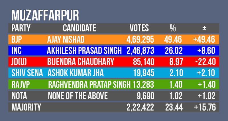 वही जॉर्ज फर्नांडिस ने 2004 में इस सीट पर जीत दर्ज की| 2014 के चुनावों में अजय निषाद ने बीजेपी के टिकट से चुनाव लड़ा था जो अभी मौजूदा सांसद भी हैं |