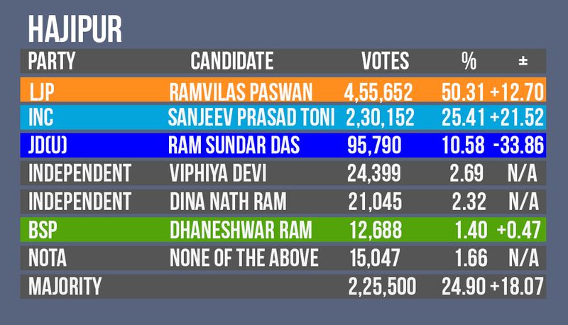 लोजपा के मुखिया राम विलास पासवान इसी सीट से आठ बार सांसद रहे, 2009 में इस सीट पर जेडीयू के राम सुन्दर दास ने उन्हें शिकस्त दी थी| हाजीपुर, लालगंज, महुआ, राजापाकर (SC), राघोपुर और महनार विधानसभा क्षेत्रों से सम्मिलित हाजीपुर रेड कॉरिडोर का हिस्सा है| भूमिहार और अनुसूचित जाति वर्ग मतदाताओं का उत्तरी बिहार में काफी प्रभाव रहा है | 2008 में पातेपुर विधानसभा सीट उजिआरपुर लोक सभा क्षेत्र में जोड़ दिया गया वही उच्च वर्ग प्रभुत्व लालगंज को हाजीपुर लोकसभा क्षेत्र का हिस्सा करार दिया गया |