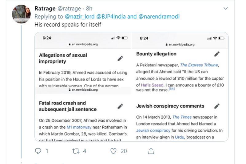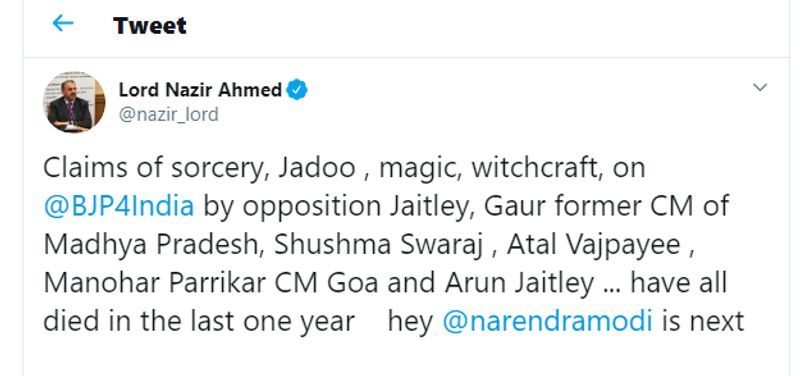 नई दिल्ली: पाकिस्तान में पैदा हुए ब्रिटेन के मुस्लिम सांसद नजीर अहमद ने बेहद आपत्तिजनक टिप्पणी की है। उसने पिछले कुछ दिनों में मारे गए बीजेपी के दिवंगत नेताओं का जिक्र करते हुए विवादास्पद ट्विट किया।