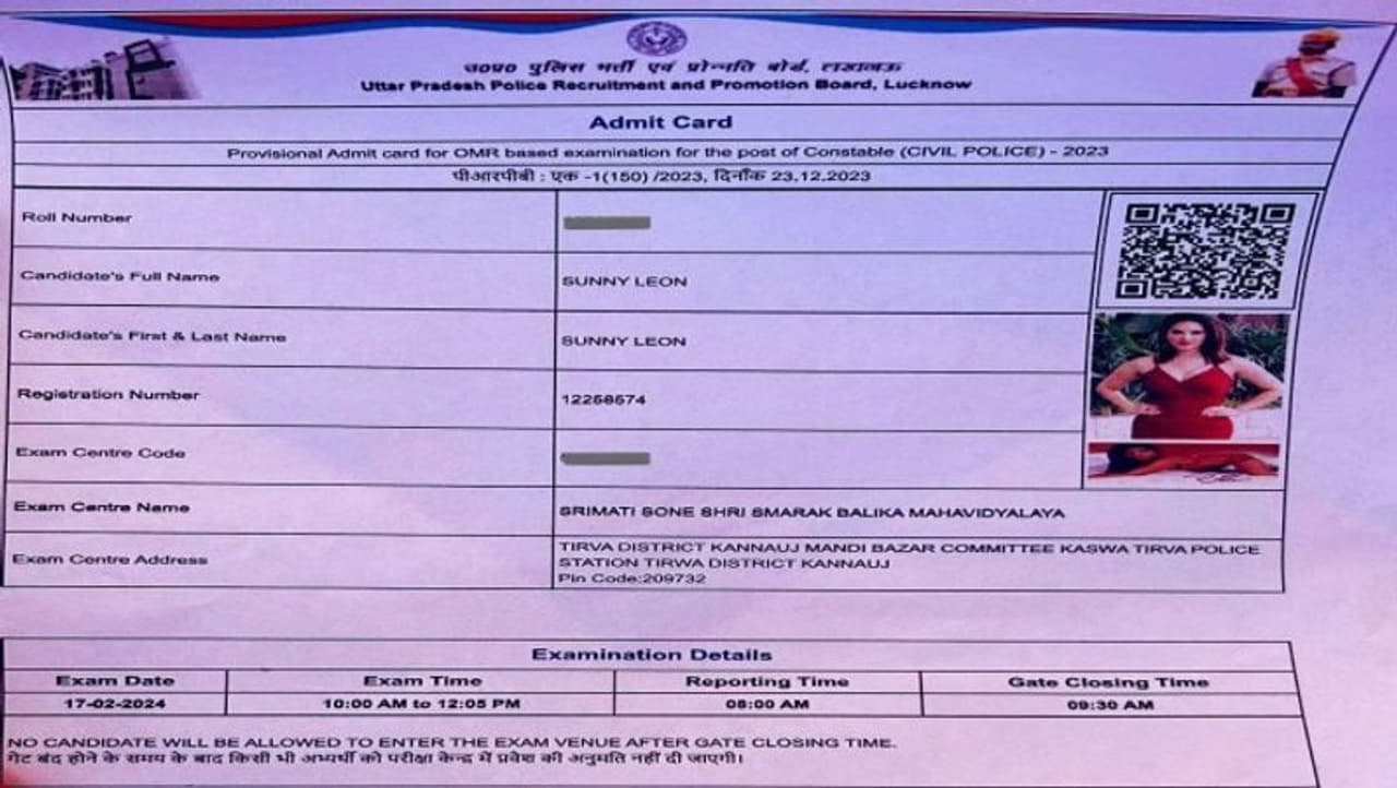 यूपी पुलिस परीक्षा में कन्नौज के एक परीक्षार्थी का एडमिट कार्ड सोशल मीडिया पर वायरल हो रहा है और इस वायरस एडमिट कार्ड पर लोग तरह तरह के कमेंट कर रहे हैं। कुछ लोगों को यह एडमिट कार्ड फेक लग रहा है, किसी को फोटोशॉप लग रहा है। लेकिन जब इस एडमिट कार्ड का वीडियो आया तो लोग हैरान रह गए कि ना तो यह फोटोशॉप है, ना ही फेक है बल्कि यह किसी की शरारत है। इस परीक्षार्थी का नाम है सनी लियोन जो कि बॉलीवुड की एक्ट्रेस है।