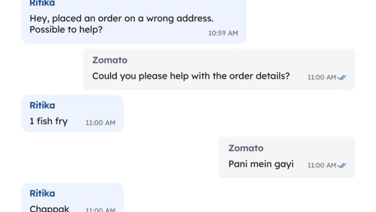 पिछले दिनों इंस्टाग्राम पर एक रील बहुत वायरल हो रही थी जिसमें खिलाड़ी बार-बार कहते हैं मछली, पानी में गई, छपाक, यह एक तरह का गेम है जिसमें वह खिलाड़ी आउट होता है जो गलत बोल देता है। इस गेम को लेकर कई लोगों ने फेसबुक और इंस्टा रील बनाई। जोमैटो भी इस तरह के कंटेंट पर मजा लेने में पीछे नहीं रहता। जोमैटो कस्टमर केयर की वायरल चैट भी कुछ ऐसी ही है जिसमें रितिका नाम की लड़की कहती है " मैंने अपना आर्डर गलत एड्रेस पर भेज दिया है कृपया मेरी मदद करें" जोमैटो सवाल करता है "क्या आप आर्डर डिटेल बता सकती हैं" रितिका जवाब देती है "वन फिश फ्राई" जोमैटो का जवाब होता है "पानी में गई" रितिका कहती है छपाक। अब यह स्क्रीनशॉट सोशल मीडिया के सभी प्लेटफार्म पर खूब वायरल हो रहा है।