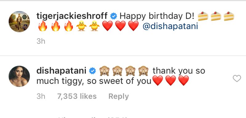 डांस वीडियो पोस्ट करते हुए टाइगर श्रॉफ ने लिखा 'हैप्पी बर्थडे डी' यानी 'जन्मदिन की बधाई हो डी (Happy birthday D! 🍰🍰🍰🔥🔥🔥🐥🐥❤❤❤ @dishapatani)' टाइगर श्रॉफ की पोस्ट पर दिशा पटानी ने रिपलाइ करते हुए कहा, 'तुम्हारा शुक्रिया टिग्गी, सो स्वीट ऑफ यू (thank you so much tiggy, so sweet of you❤❤❤ )'।