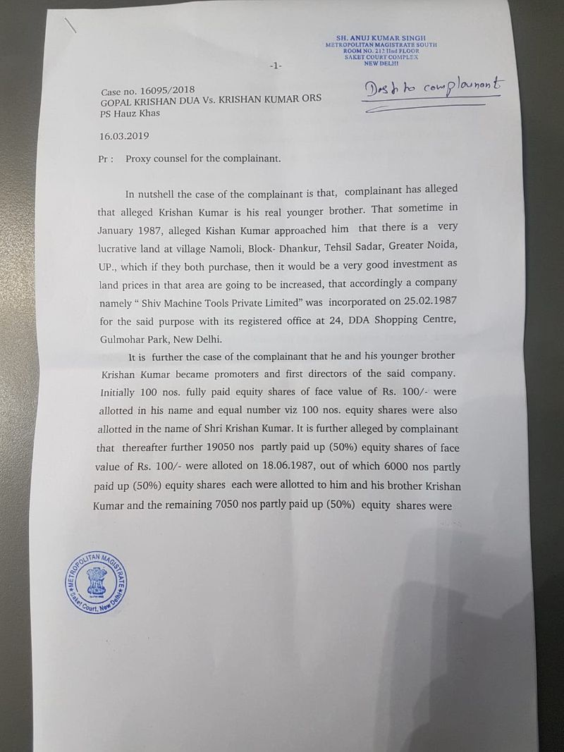 गोपाल दुआ का आरोप है कि सन् 2013 में उनके छोटे भाई कृष्ण कुमार ने बिना कोई नोटिस भेजे जाली तरीके और फर्जी दस्तावेजों के आधार पर कंपनी अपने नाम करवा ली है। यह कंपनी दोनों ने 1987 में मिलकर ग्रेटर नोएडा में खोली थी।