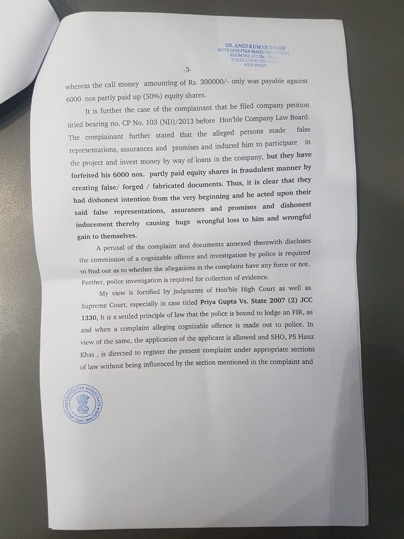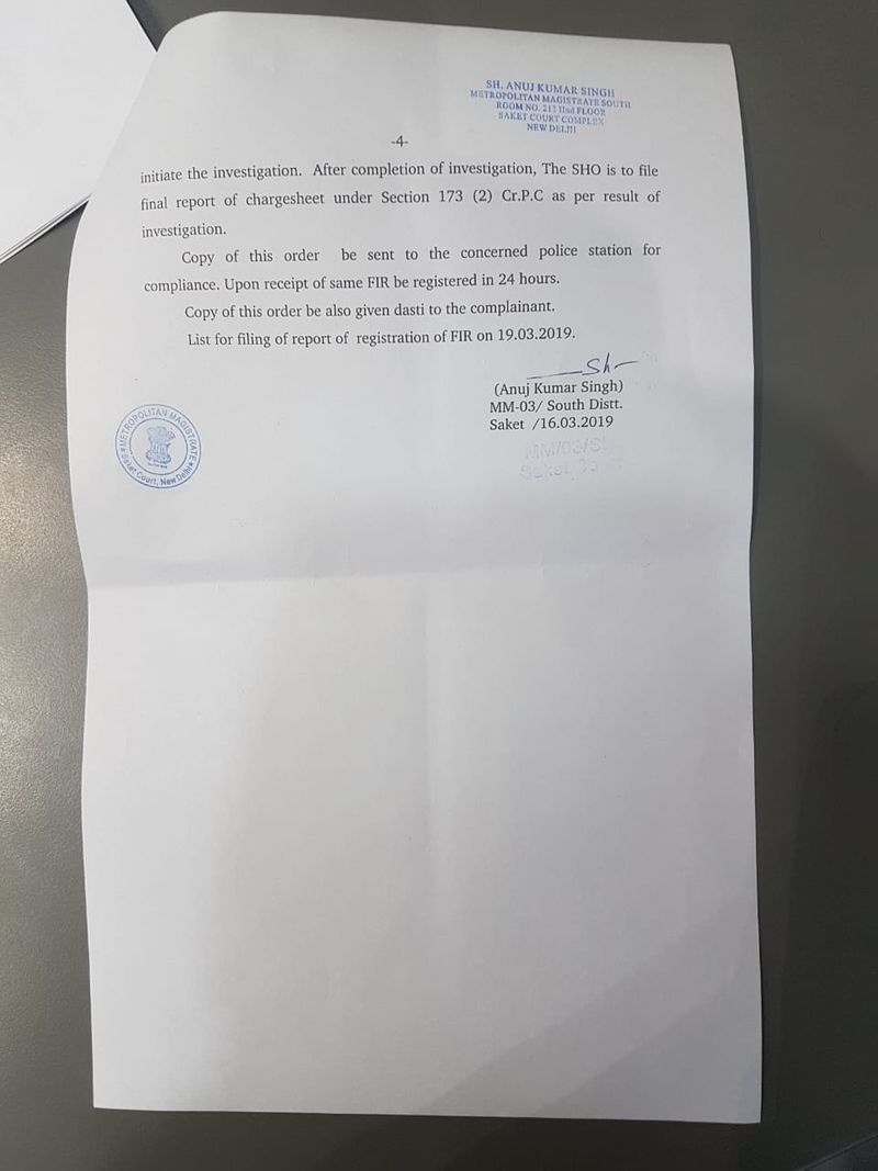 गोपाल की शिकायत और दस्तावेज को देखने के बाद दिल्ली की साकेत जिला अदालत के मेट्रोपॉलिटिन मजिस्ट्रेट अनुज कुमार सिंह ने इस मामले की जांच के आदेश दिए हैं। पुलिस को साक्ष्य जुटाने को कहा गया है।