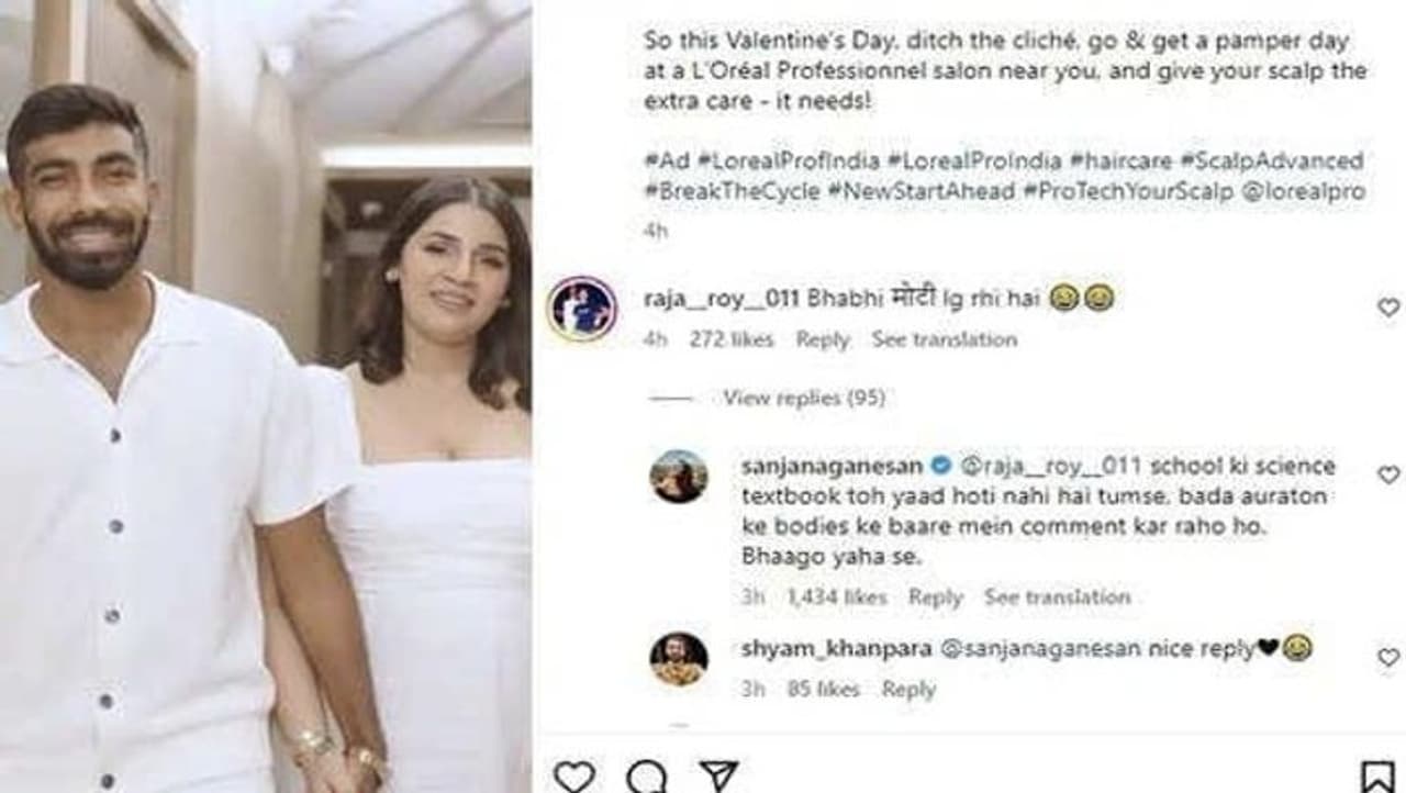 फास्ट बॉलर जसप्रीत बुमराह गुरुवार को राजकोट में इंग्लैंड के खिलाफ तीसरे टेस्ट में प्रदर्शन करेंगे। क्योंकि सीरीज अभी एक एक से बराबर है और तीन टेस्ट बाकी है तो बाकी खिलाड़ियों की तरह जसप्रीत बुमराह भी अपने परिवार के साथ समय बिता रहे थे। इस दौरान बुमराह ने वैलेंटाइन डे के मौके पर अपनी पत्नी संजना गणेशन के साथ इंस्टाग्राम पर एक तस्वीर शेयर किया। तस्वीर में कपल काफी खुश नजर आ रहा है। लेकिन तस्वीर पर एक यूजर ने कमेंट किया भाभी मोटी लग रही है- इस यूजर को संजना ने जवाब देते हुए लिखा स्कूल में साइंस की किताबें तो याद नहीं होती है तुमसे बड़ी औरतों की बॉडी के बारे में टिप्पणी कर रहे हो भागो यहां से।