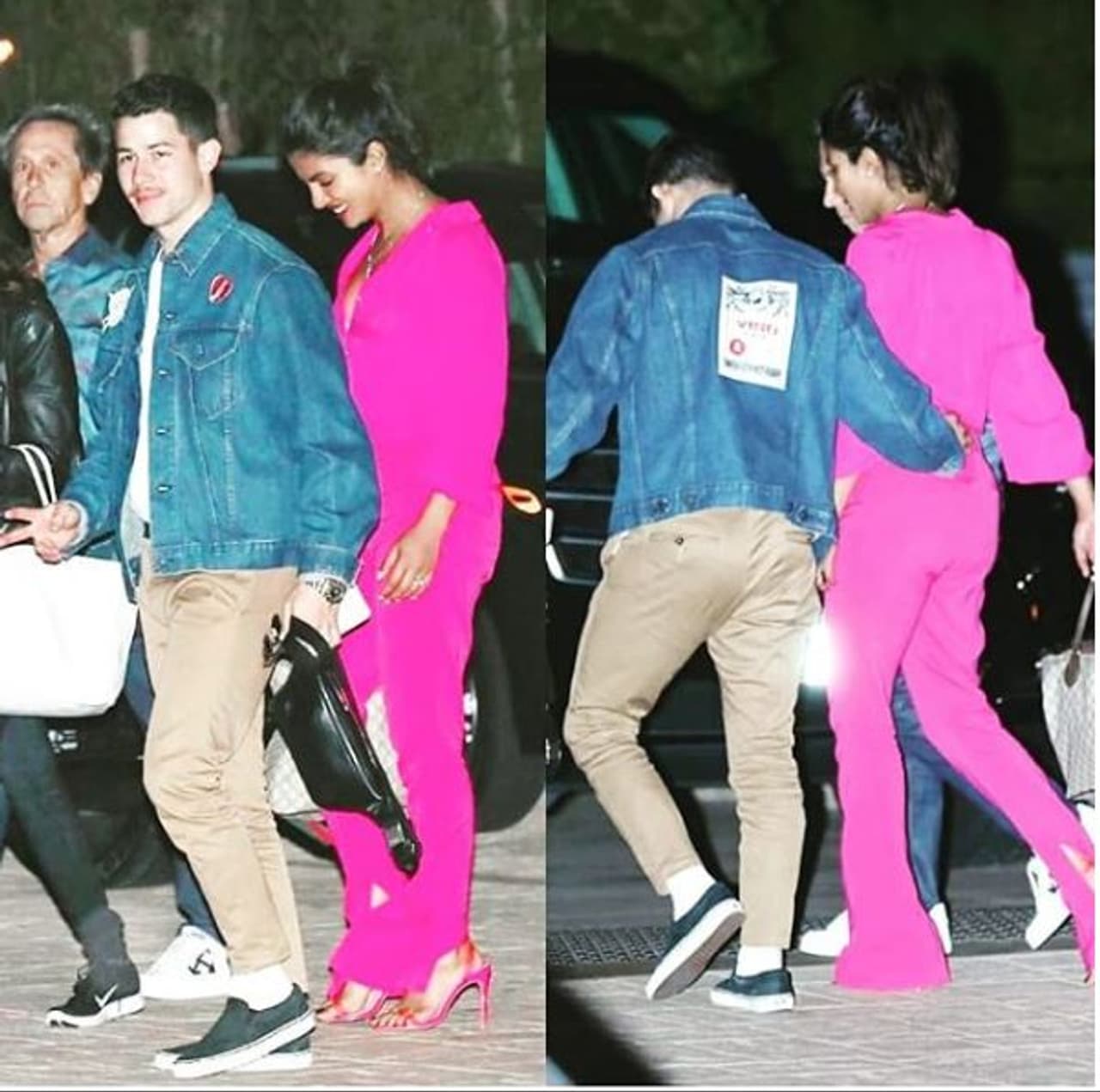 प्रियंका ने पिंक कलर का जंपसूट पहना है और निक ने शर्ट-पैंट व डेनिम जैकेट पहने हुए नजर आए।
