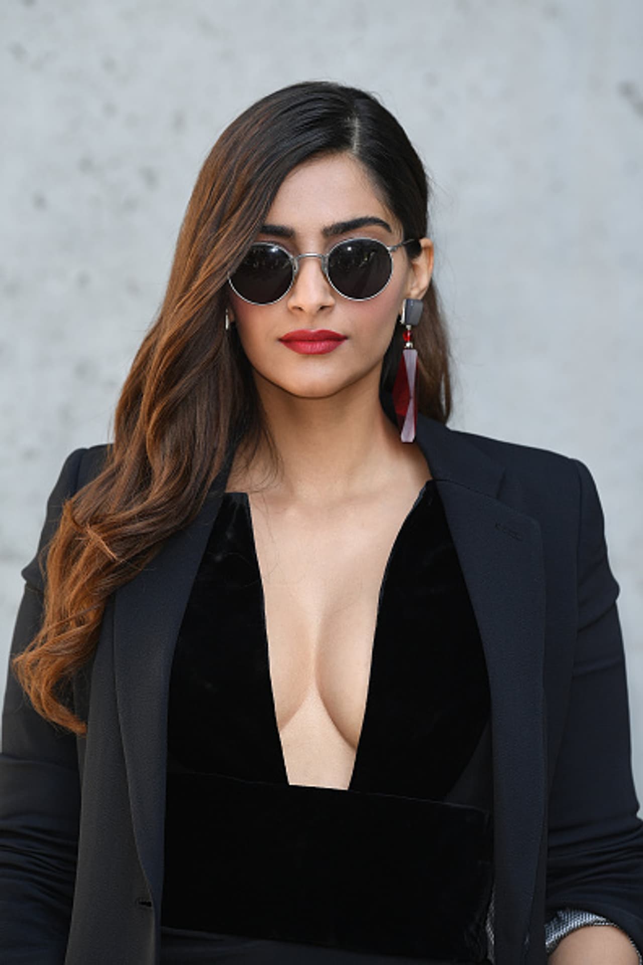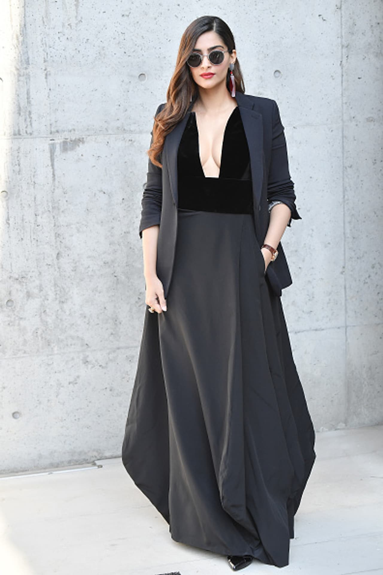 सोनम ने ब्लैक गाउन के साथ एक ब्लेजर कैरी किया है, जो कि सोनम को काफी ग्लैमरस लुक दे रहा है।