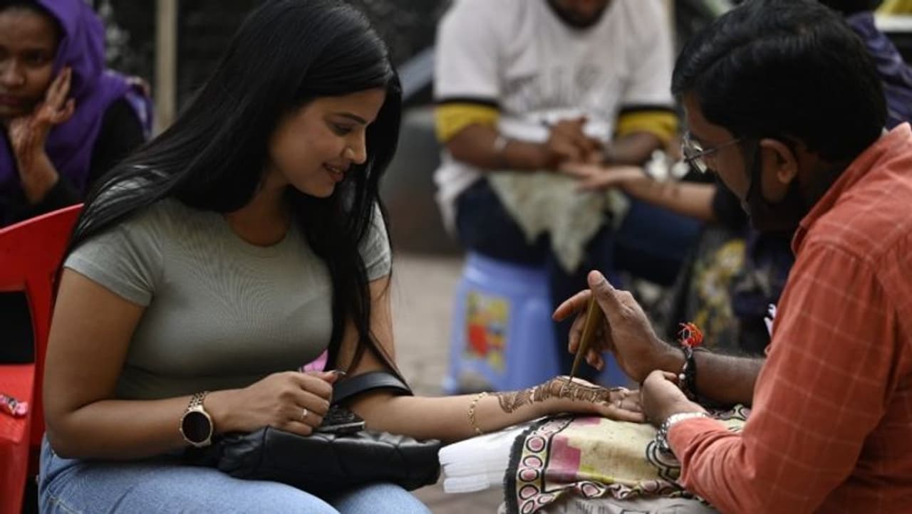 आज मेहंदी वालों के चेहरे पर ख़ुशी नज़र आ रही थी। ग्राहकों की लम्बी लाइन लगी थी। पूरे बाजार में जगह जगह मेहंदी आर्टिस्ट अपना काउंटर खोले बैठे थे और सबकी दुकान चल रही थी।