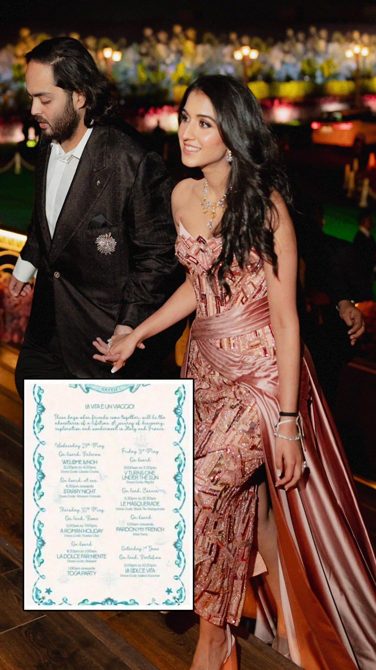 लवबर्ड्स अनंत-राधिका का प्री वेडिंग फंक्शन 3-4 दिन तक चलेग। 28 मई को 12 चार्टर प्लेन से गेस्ट क्रूज पर पहुंचेंगे और 29 मई से सेलिब्रेशन की शुरुआत होगी। लंच के बाद शाम को स्टार्स नाइट थीम पार्टी होगी जो 30 मई तक A Roman Holiday के साथ आगे बढ़ेगी। इस दौरान गेस्ट टूरिस्ट चिक आउटफिट्स में नजर आएंगे। वहीं इसी रात लॉ डोल्से फार निएंटे तो 12 बजे करीब टोगा पार्टी होगी। 31 मई को We Turns one Under the sun,ले मास्टर कोड,थीम होगा। वहीं आखिरी दिन सेलिब्रेशन ला डोल्से वीटा थीम के साथ खत्म होगा।