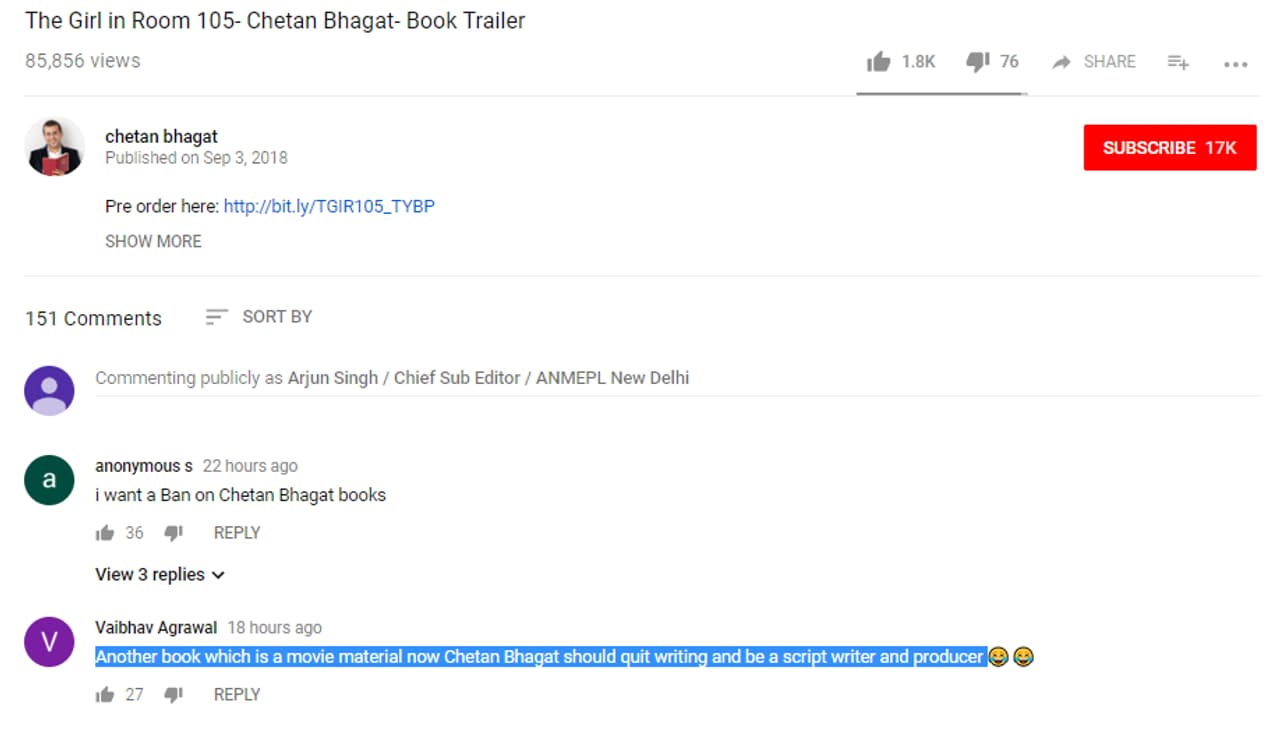 इस बीच, उनके किताब के ट्रेलर को काफी पसंद किया जा रहा है। कुछ ही समय में इसे 85,000 से ज्यादा लोग देख चुके हैं। इसे 2,000 से ज्यादा लोगों ने पसंद भी किया है। यू-ट्यूब पर जारी इस ट्रेलर की सबसे खास बात है इस पर लोगों द्वारा दी जा रही प्रतिक्रिया। इसमें उनकी लेखनी को पसंद करने वाले कह रहे हैं कि उन्हें अपनी किताब को किसी किताब या नेटफिलिक्स सीरीज में तब्दील कर देना चाहिए, वहीं कई लोग ऐसे भी हैं, जो उनके लिखने पर प्रतिबंध लगाने की बात कर रहे हैं। कुछ लोगों की राय है कि चेतन भगत को किताब छोड़कर फिल्मों का स्क्रीन प्ले और स्क्रिप्ट लिखना चाहिए। यह किताब अक्टूबर में बाजार में आ जाएगी। लेखक का दावा है कि यह 'चेतन भगत की लव स्टोरी' नहीं है। यानी यह उनके प्रेम कहानी कहने के अंदाज से अलग है।