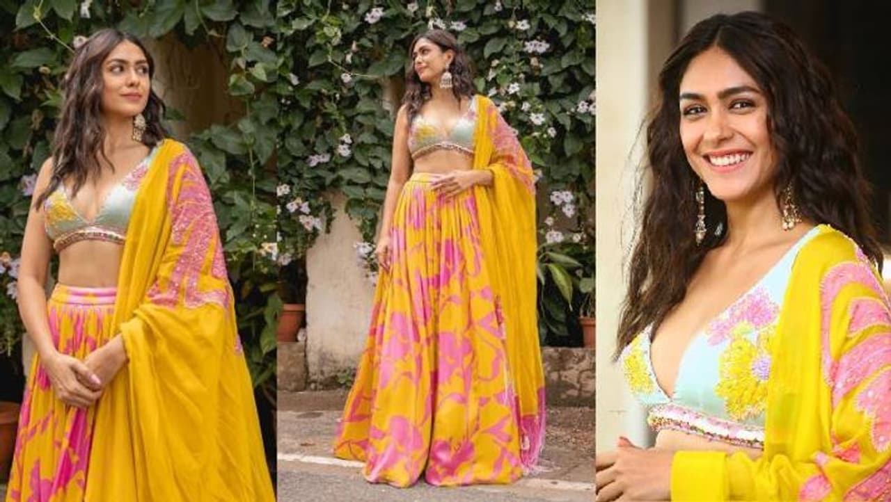 धागे की एम्ब्रॉयडरी और सीक्वेन वर्क से सजे प्लंजिंग नेकलाइन ब्लाउज में एक्ट्रेस मृणाल ठाकुर हूर की परी लग रही हैं। पिंक और येलो के कॉम्बिनेशन लहंगे का कलर ब्लाउज में की गई एम्ब्रॉयडरी में भी नज़र आ रहा है। आप भी एम्ब्रॉयडरी या फिर मल्टीकलर साड़ी के साथ एम्ब्रॉयडरी प्लंजिंग नेकलाइन ब्लाउज ट्राई करें। स्लीवलेस ब्लाउज के नीचे की ओर आप चाहे तो टेलर से कहकर गोटापट्टी या फिर मिरर वर्क वाली पट्टी एड करा सकती हैं। अगर आप ऐसे ब्लाउज ऑनलाइन खरीदेंगी तो आसानी से ये आपको 1000 रुपये अंदर मिल जाएंगे।