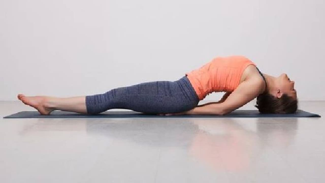 - सबसे पहले योगा मैट में लेट जाएं। आप अपने दोनों हाथों को बैक(बट) के नीचे रखें।