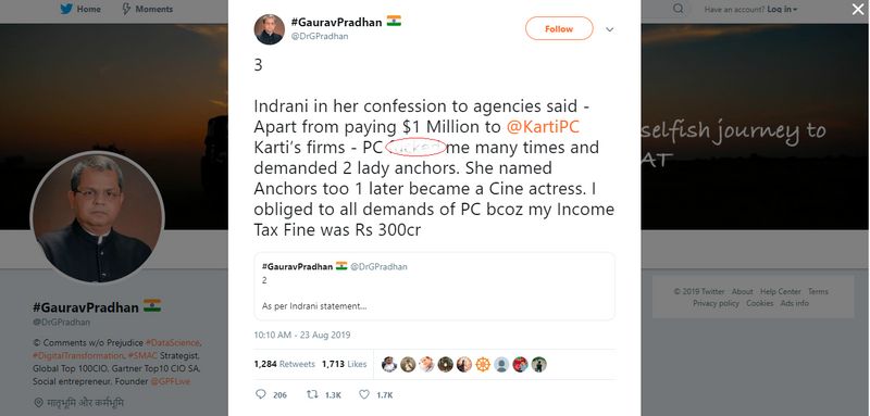 गौरव प्रधान ने दूसरे ट्वीट में कहा कि इंद्राणी मुखर्जी ने जांच एजेंसियों को ये भी बताया है कि एम के वेणु ने इंद्राणी मुखर्जी और पीटर मुखर्जी की पी चिदंबरम से मीटिंग फिक्स करवाई थी। उन्होंने कहा कि जहां तक दो महिला एंकरों की बात है जिसे कथित तौर पर पी चिदंबरम ने मांगा था वो एक म्यूजिक चैनल से थीं।
