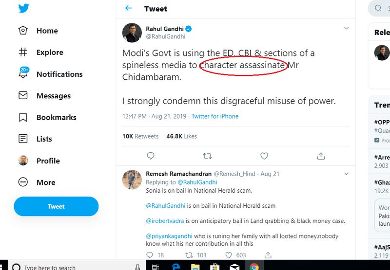 शायद राहुल गांधी को इस बात का एहसास था कि गिरफ्तारी के बाद अब लोगों के निशाने पर चिदंबरम का चरित्र होगा। इसलिए पूर्व कांग्रेस अध्यक्ष ने अब से कोई 8 दिन पहले यानी 21 अगस्त को ही ट्विट करके बता दिया था कि चिदंबरम के चरित्र हनन की बारी आएगी। उन्होंने चरित्र हनन के लिए अंग्रेजी में character assasination शब्द का इस्तेमाल किया था।