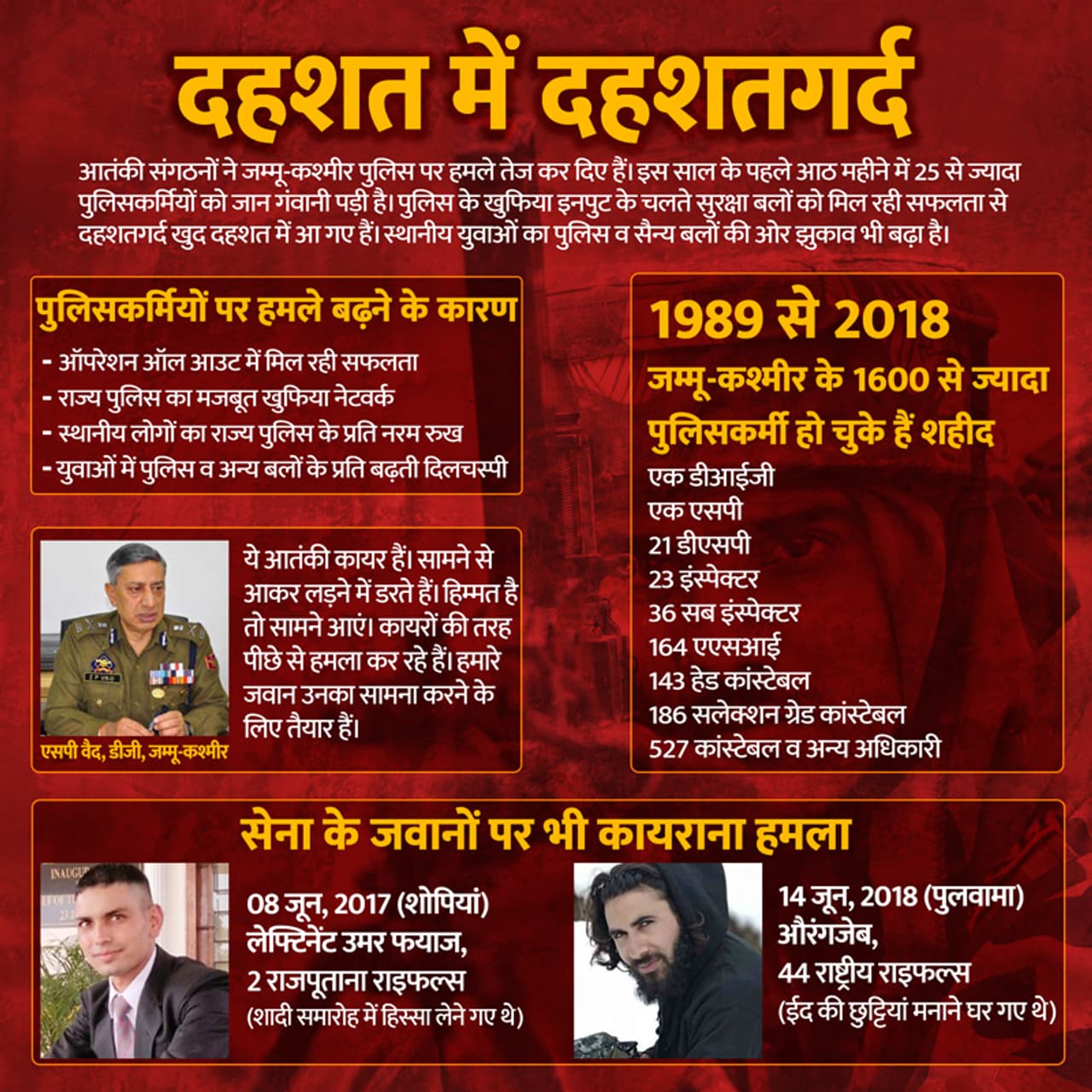 वर्ष 2018 में अभी तक 25 पुलिसकर्मियों को जान गंवानी पड़ी है। बकरीद के दिन आतंकियों ने अलग-अलग जगह तीन पुलिसकर्मियों की निर्ममता से हत्या कर दी। इसमें परिवार के साथ ईद मनाने आए पुलिस इंसपेक्टर मोहम्मद अशरफ डार, कांस्टेबल फयाज अहमद शाह और पुलवामा के मोहम्मद याकूब शामिल हैं। डार को आतंकियों ने उनके घर में घुसकर गोली मार दी थी। आतंकियों से मुठभेड़ और हमलों में 16 पुलिस अधिकारियों और 6 एसपीओ की मौत हुई है।