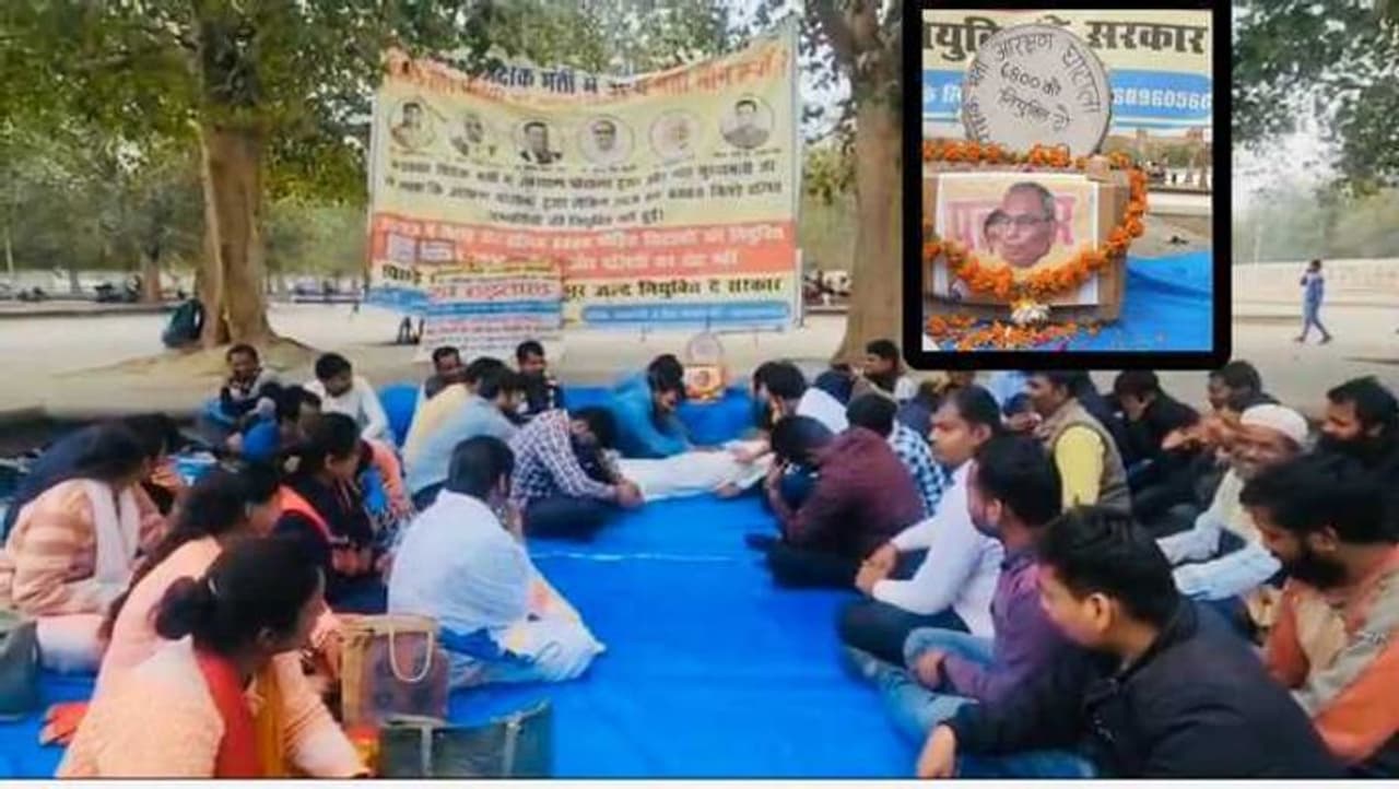अब आप राजभर के बयान से नाराज 69000 शिक्षक भर्ती अभ्यर्थियों ने आज इको गार्डन में अपने धरना स्थल पर ओपी राजभर की तस्वीर पर फूल चढ़कर शोक सभा आयोजित की और नारा दिया हमारे चाचा का जमीर मर गया।