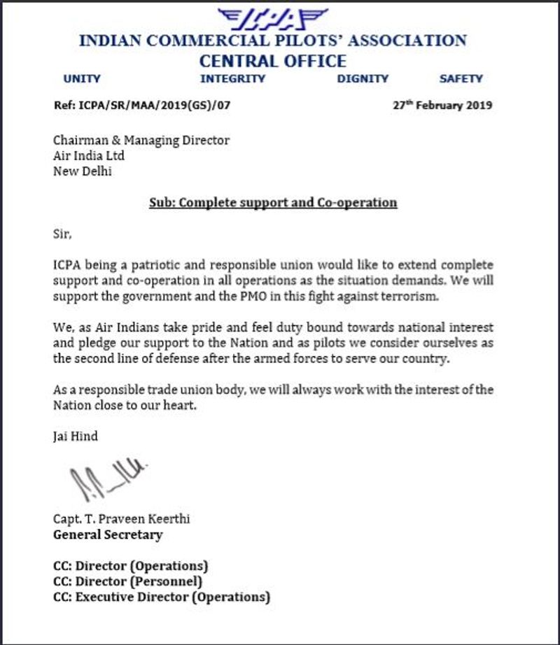 दूसरी तरफ इंडियन कॉमर्शियल पायलट एसोसिएशन ने एक पत्र लिखकर पीएमओ से पूरी तरह सपोर्ट देने की बात कही है। पत्र में कहा गया है कि देशभक्त और जिम्मेदार यूनियन होने के कारण आईसीपीए ने सभी तरह के ऑपरेशन के लिए पूरी सपोर्ट और को-ऑपरेशन बढ़ाने का निर्णय लिया है।
