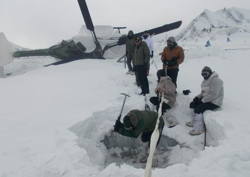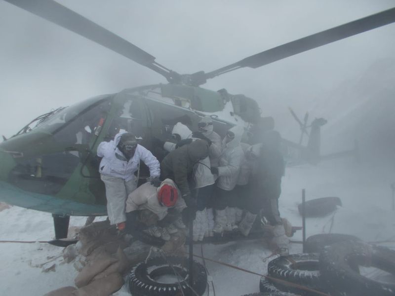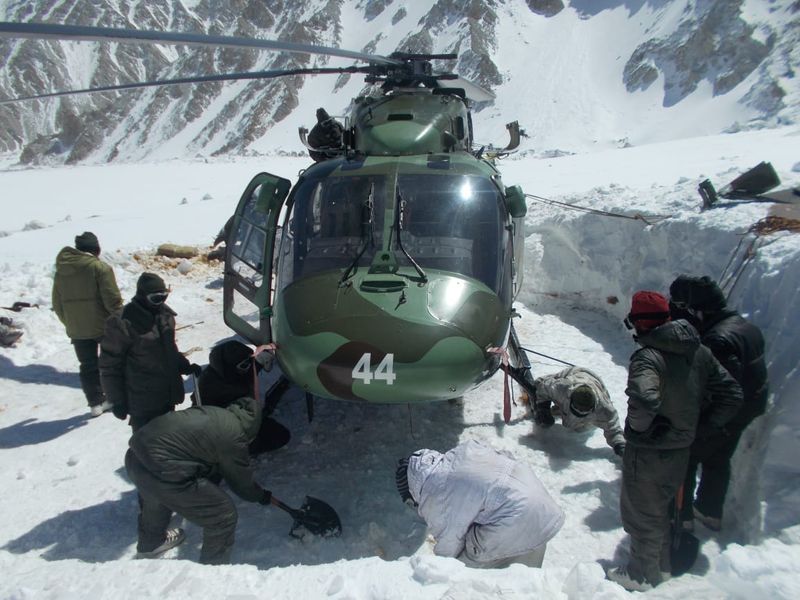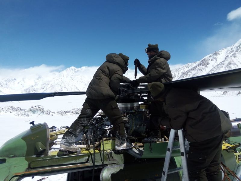 18,000 फीट की ऊंचाई पर फंसा हुआ था एएलएच ध्रुव हेलीकॉप्टर। सेना के तकनीशियनों और पायलटों ने की मरम्मत। हेलीकॉप्टर सुरक्षित सियाचिन बेस कैंप पर लाया गया।