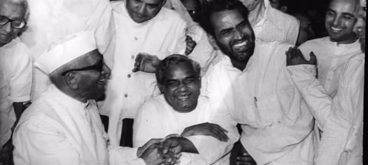 1975 में तत्कालीन प्रधान मंत्री इंदिरा गांधी ने आपातकाल लागू किया था। विरोधियों का दमन हुआ था। इसके खिलाफ जय प्रकाश नारायण (जेपी) ने संपूर्ण क्रांति आंदोलन शुरू किया, जिसमें वाजपेयी भी जुड़े। 1977 में जनसंघ का जनता पार्टी में विलय कर दिया गया। 1977 में मोरारजी देसाई के नेतृत्व में जनता पार्टी ने पहली बार केंद्र में सरकार बनाई। उस समय वाजपेयी केंद्रीय मंत्री बने। उन्हें विदेश मंत्रालय की जिम्मेदारी दी गई। विदेश मंत्री के तौर पर वाजपेयी संयुक्त राष्ट्र महासभा में हिंदी में भाषण देने वाले पहले राजनेता थे।