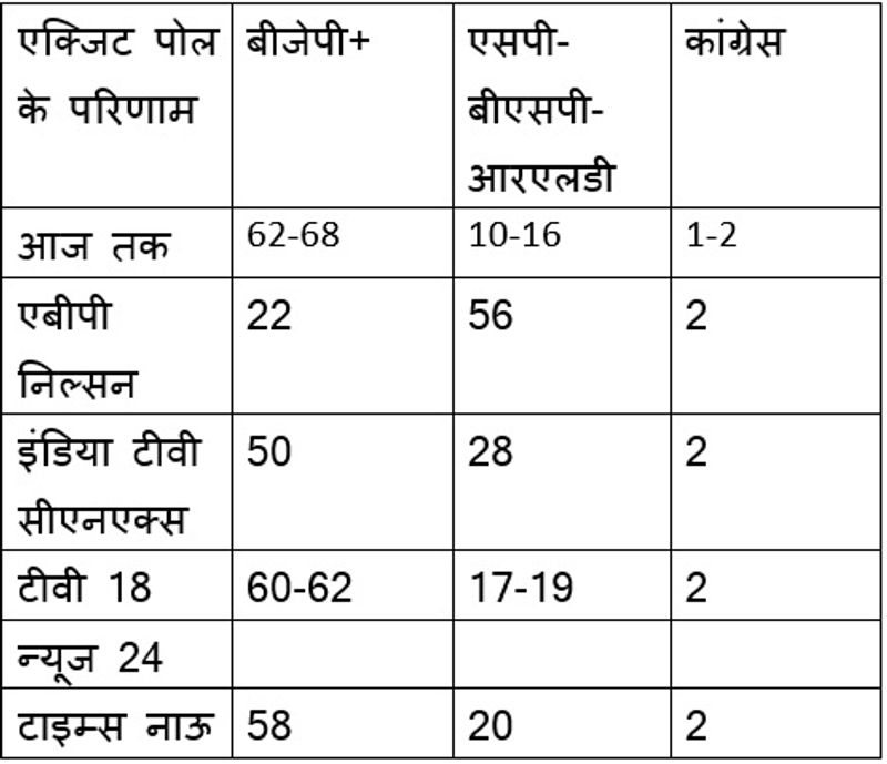 लोकसभा चुनाव के बाद अब दिल्ली की सत्ता की चाबी फिर बार फिर उत्तर प्रदेश के हाथ में रहेगी। यहां पर बीजेपी और एसपी-बीएसपी गठबंधन में कड़ा मुकाबला है। राज्य की 80 सीटें हैं। बीजेपी ने 2014 के चुनाव में यहां से 73 सीटें जीती थी। एबीपी-नील्सन एग्जिट पोल के मुताबिक पश्चिमी उत्तर प्रदेश में 27 में से 21 सीटें मिलने का अनुमान जताया जा रहा है। जबकि बीजेपी को सिर्फ 6 सीटें मिलने का अनुमान। वहीं इसके मुताबिक अवध में भी बीजेपी को नुकसान होने का अंदेशा जताया जा रहा है। वहीं टीवी 18 यूपी में 39 सीटों में से एनडीए को 25 से 29 सीटें दे रहा है जबकि गठबंधन को 10 से 12 सीटें मिल रही हैं। जबकि इंडिया टीवी के सर्वे के मुताबिक बीजेपी को 50 सीटें तो गठबंधन को 28 सीटें मिल रही हैं। इसके साथ ही कांग्रेस को दो सीटें मिलने का अनुमान है।