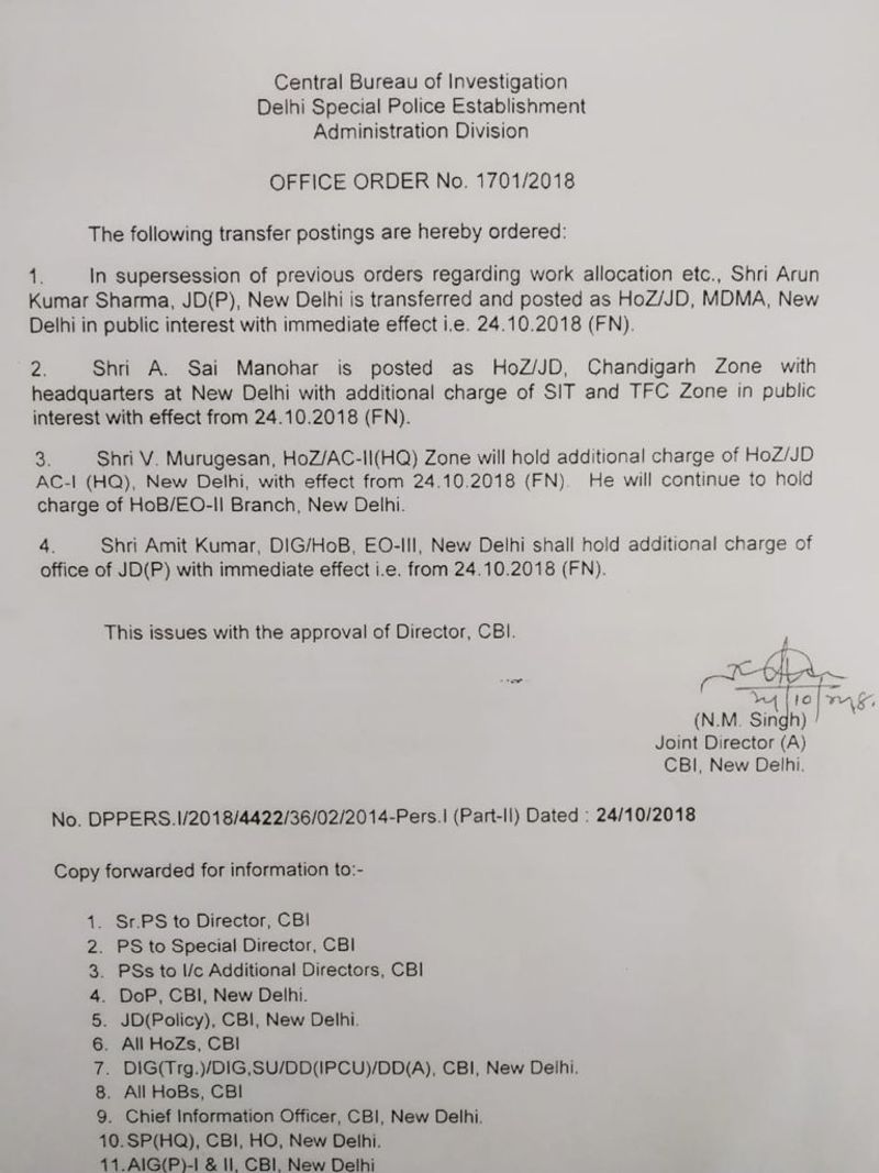 इससे पहले, सरकार ने केंद्रीय जांच एजेंसी में अधिकारियों के बीच चल रही 'जंग' पर कड़ी कार्रवाई करते हुए एजेंसी के शीर्ष दो अधिकारियों को जबरन छुट्टी पर भेज दिया। एजेंसी में हुई इस कार्रवाई के पीछे राष्ट्रीय सुरक्षा सलाहकार अजीत डोभाल हैं। उन्हें एक दिन पहले ही प्रधानमंत्री नरेंद्र मोदी ने इस मसले को निपटाने का जिम्मा दिया है।
