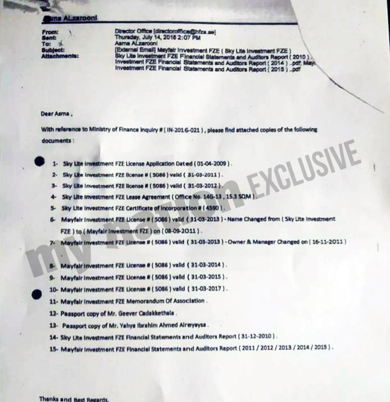 10. ईडी के दस्तावेज के मुताबिक स्काई लाइट इनवेस्टमेंट एफजेडई (मे फेयर इनवेस्टमेंट एफजेडई) कोई बिजनेस नहीं करती। इस कंपनी का खाता 1,50,000 दिरहाम में खोला गया था। ईडी के मुताबिक, कंपनी ने साल दर साल भारी निवेश का दावा किया है। यानी एक शेल कंपनी बनाकर उसका मनी लॉन्ड्रिंग के लिए इस्तेमाल किया जा रहा था।