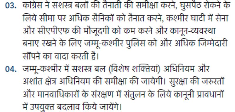 घोषणापत्र में कांग्रेस ने जम्मू-कश्मीर में सशस्त्र बलों की तैनाती की समीक्षा करने, घुसपैठ रोकने के लिए सीमा पर अधिक सैनिकों को तैनात करने, कश्मीर घाटी में सेना और केंद्रीय अर्धसैनिक बलों यानी सीएपीएफ की मौजूदगी को कम करने और कानून-व्यवस्था बनाए रखने के लिए जम्मू-कश्मीर पुलिस को और अधिक जिम्मेदारी सौंपने का वादा किया है।
