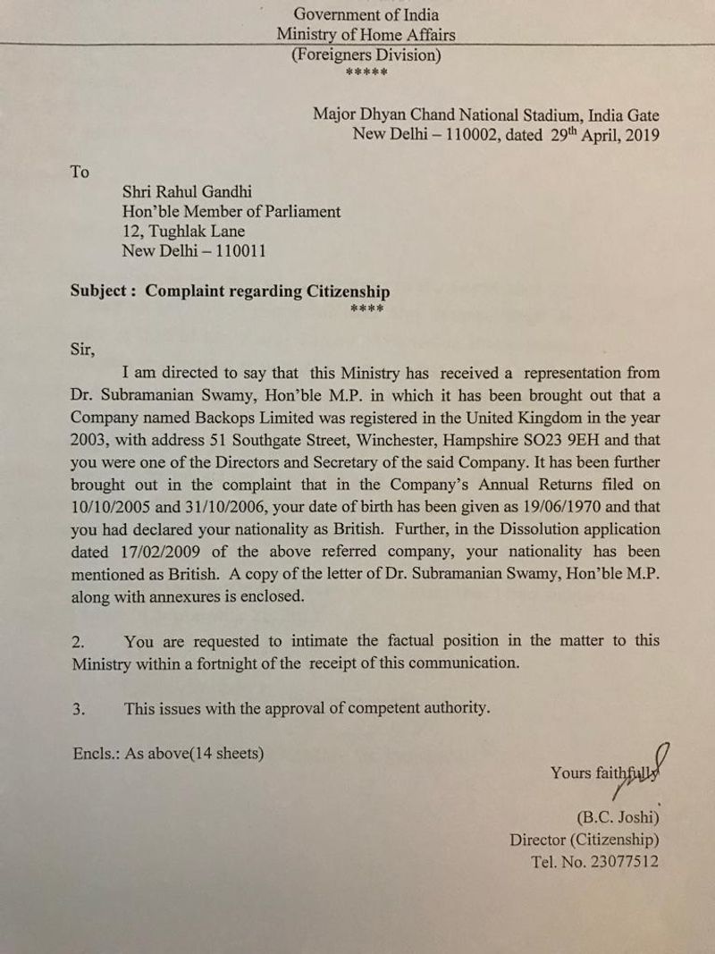 राहुल गांधी को नोटिस गृह मंत्रालय के निदेशक (नागरिकता) बीसी जोशी ने जारी किया है। जिसमें लिखा गया है कि 'गृह मंत्रालय को डॉ सुब्रह्मण्यम स्वामी की ओर से एक शिकायत मिली है, जिसमें जानकारी दी गई है कि बैकऑप्स लिमिटेड नामक कंपनी को वर्ष 2003 में यूनाइटेड किंगडम में रजिस्टर किया गया था, जिसका पता 51 साउथगेट स्ट्रीट, विंचेस्टर, हैम्पशर SO23 9EH था, और आप उसके निदेशकों में से एक तथा सचिव थे।'