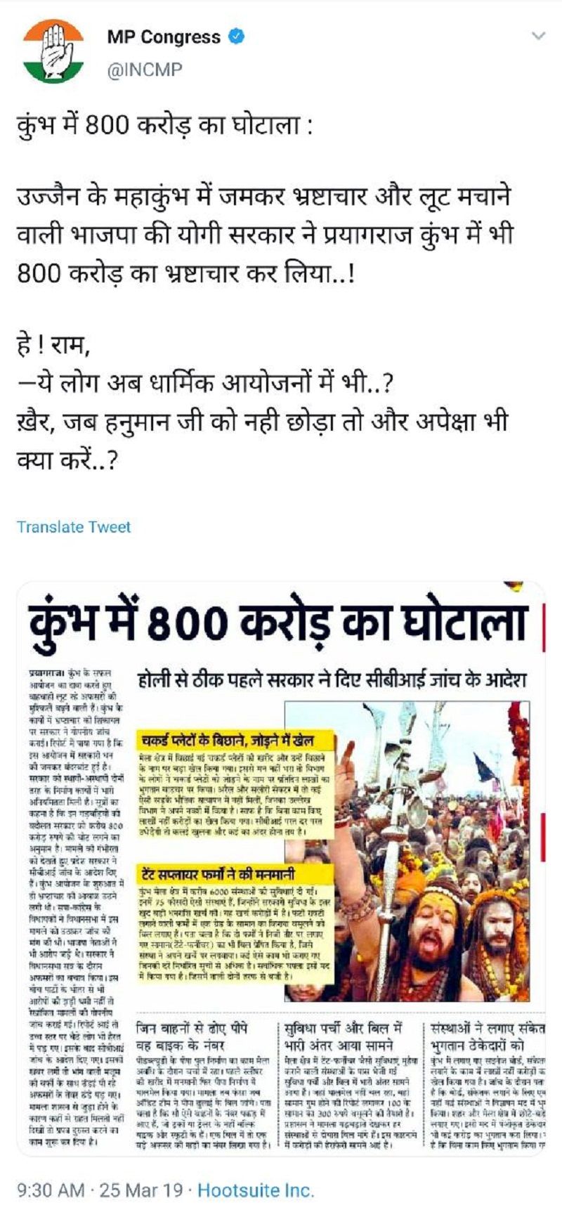 यही नहीं कांग्रेस ने हरियाणा में भाजपा के प्रभारी कलराज मिश्रा के हवाले से एक खबर प्रकाशित खबर को भी सोशल मीडिया के जरिए प्रसारित किया है। जिसमें कलराज मिश्रा को ये कहते हुए बताया गया है कि अगर कार्यकर्ता ये विरोध यूपी में करते तो मैं हत्या कर देता। असल में कलराज मिश्रा की बात का जिक्र कर रहे थे। लेकिन कांग्रेस प्रवक्ता ने उनके इस भाषण को कृष्णपाल गुर्जर के साथ जोड़ दिया। जबकि कार्यकर्ता फरीदाबाद में कृष्णपाल गुर्जर को टिकट देने का विरोध कर रहे थे। लेकिन कलराज मिश्रा इस तरह के किसी बयान भी को खारिज करते हैं। इस खबर को कांग्रेस के प्रवक्ता रणदीप सुरजेवाला ने भी प्रतिक्रिया दी। लेकिन कांग्रेस पार्टी इस तरह की फर्जी को खबरों को प्रसारित करने में पीछे रहती है। वहीं आप के सांसद संजय सिंह ने भी इस कुंभ की खबर पर ट्विट किया, लेकिन बाद में उन्होंने अपने ट्विटर हैंडल से हटा दिया है।