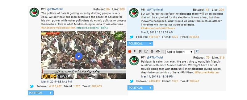 इस सुरक्षा एजेंसी ने अपनी रिसर्च में पाया है कि पाकिस्तान के प्रधानमंत्री इमरान खान की पार्टी तहरीक-ए-इंसाफ को भारतीय चुनाव और बीजेपी सरकार के खिलाफ निगेटिव प्रचार-प्रसार में लिप्त देखा जा रहा है।