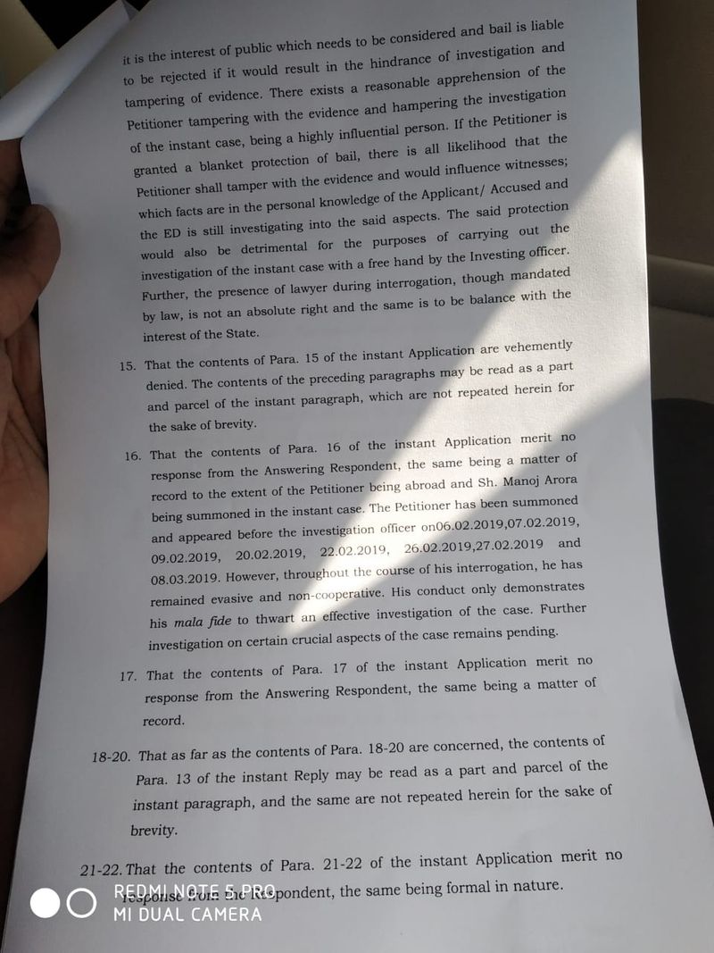 प्रवर्तन निदेशालय के अधिकारियों का यह भी कहना था कि वाड्रा प्रभावशाली व्यक्ति है,इस बात की पूरी सम्भावना है कि वाड्रा अग्रिम ज़मानत मिलने पर सबूतों के साथ छेड़छाड़ कर सकते है।