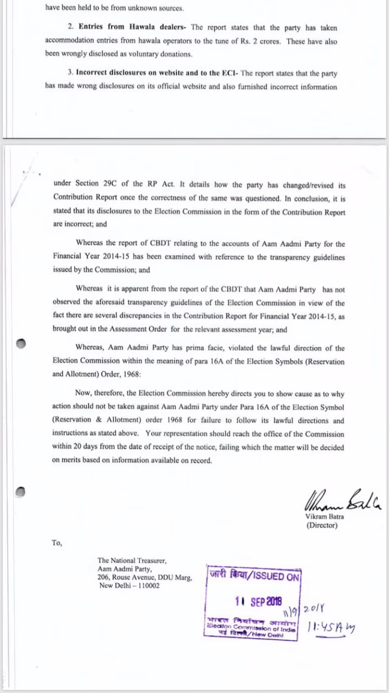 आयकर विभाग और चुनाव आयोग को दिए अलग-अलग आंकड़ों को लेकर यह नोटिस जारी किया गया है। नोटिस में सेंट्रल बोर्ड ऑफ डायरेक्ट टैक्सेज यानी सीबीडीटी की भेजी रिपोर्ट के आधार पर आम आदमी पार्टी पर आरोप है कि उसने साल 2014-15 में चंदे के मामले में पारदर्शिता के चुनाव आयोग के नियमों का उल्लंघन किया है।