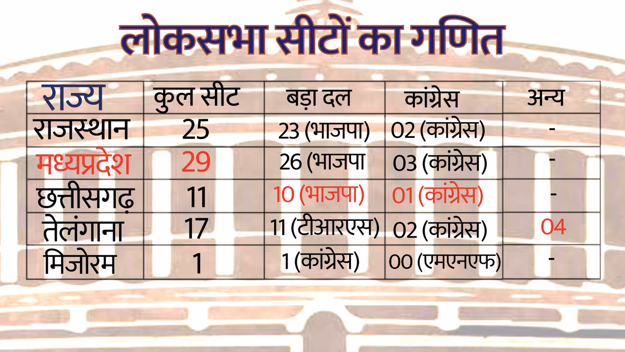 इस समय मध्य प्रदेश, राजस्थान और छत्तीसगढ़ में भाजपा की सरकारें हैं। मिजोरम में कांग्रेस की सरकार है। वहीं तेलंगाना में तेलंगाना राष्ट्र समिति सत्ता में थी। लेकिन वहां विधानसभा भंग की जा चुकी है। इन राज्यों में होने वाले चुनावों को 2019 के महासमर से पहले सेमीफाइनल माना जा रहा है।
