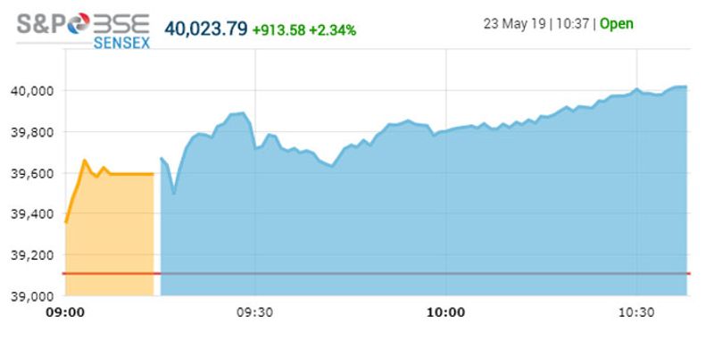बाजार के जानकारों ने अनुमान जताया था कि शेयर बाजार पहले कुछ घंटों के कारोबार के दौरान जैसे ही चुनाव नतीजे एनडीए के पक्ष में बैठते देखे जाएंगे सेंसेक्स अपने मनोवैज्ञानिक स्तर 40,000 को पार कर नया रिकॉर्ड कायम कर सकता है। गौरतलब है कि इससे पहले 2014 में भी वोटों की गिनती के साथ सेंसेक्स में उछाल दर्ज हुई थी।