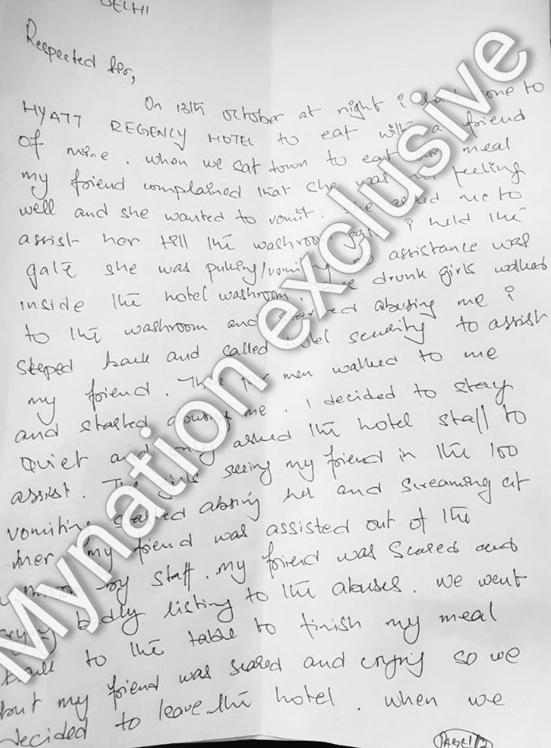 'माय नेशन' को मिली एक्सक्लूसिव जानकारी के अनुसार, हयात होटल ने अपनी सुरक्षा लॉग बुक में पूरी घटना का सिलसिलेवार ब्यौरा दर्ज किया है। इसके अनुसार, '14 अक्टूबर, 2018 को 03.40 मिनट पर मिस्टर प्रीतीश (असिस्टेंट मैनेजर कैफे) ने असिस्टेंट मैनेजर सुरक्षा विजय को बताया कि कैफे के लेडी वॉशरूम में एक कपल चला गया है। इस पर असिस्टेंट मैनेजर सुरक्षा विजय महिला सिक्योरिटी गार्ड के साथ वहां पहुंचे। उन्होंने देखा कि जो व्यक्ति लेडी वॉशरूम में घुसा था उसे कुछ महिलाओं ने पहले ही वहां से बाहर कर दिया था।'
