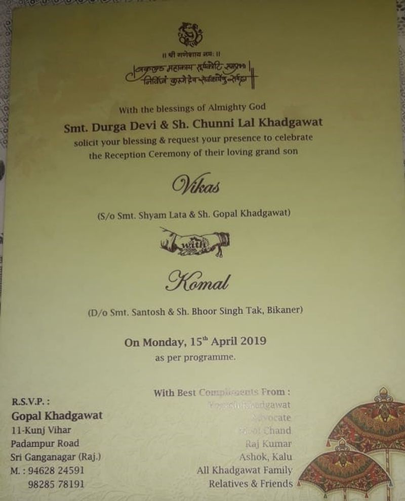 गोपाल खड़गावत की ओर से परिवारिक सदस्यों एवं दोस्तों को लिखा गया है, ‘मैंने शगुन की परंपरा को बंद करने का फैसला किया है। लेकिन हो सकता है कि आप में से कुछ लोग इससे इत्तेफाक न रखें। इसलिए मैं शगुन तो स्वीकार करूंगा लेकिन पूरा का पूरा पैसा भारत के वीर फंड में दान कर दूंगा। इससे शहीदों के परिवारों की कुछ मदद हो सकेगी।’