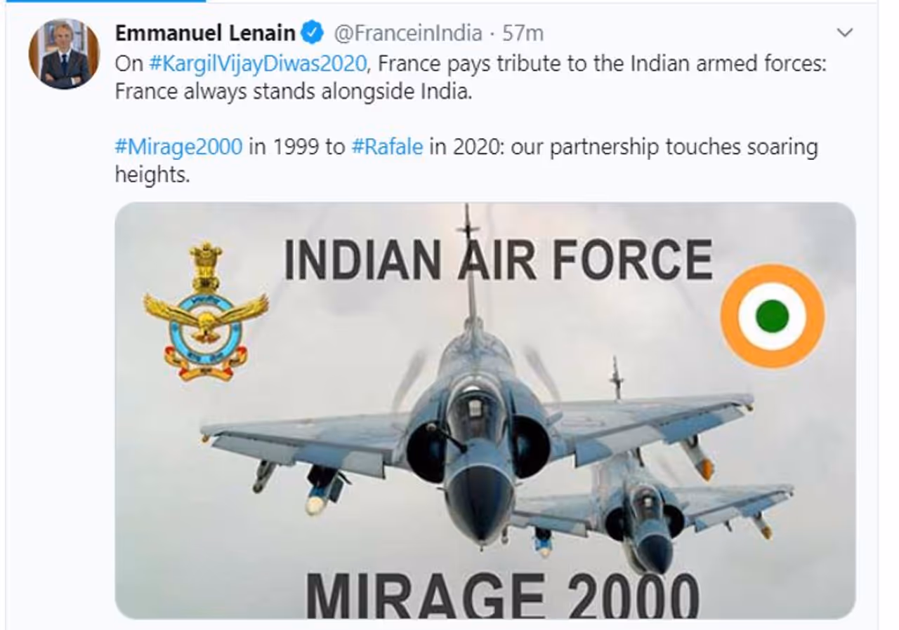 करगिल विजय दिवस के मौके पर फ्रांस ने भारत के वीर जवानों को श्रद्धांजलि दी। इस मौके पर फ्रांस के राजदूत इमेनुअल लेनिन ने ट्वीट किया, फ्रांस हमेशा भारत के साथ खड़ा है। 1999 में मिराज 2000 से 2020 में राफेल तक। हमारी साझेदारी लगातार नई ऊंचाइयां छू रही है।