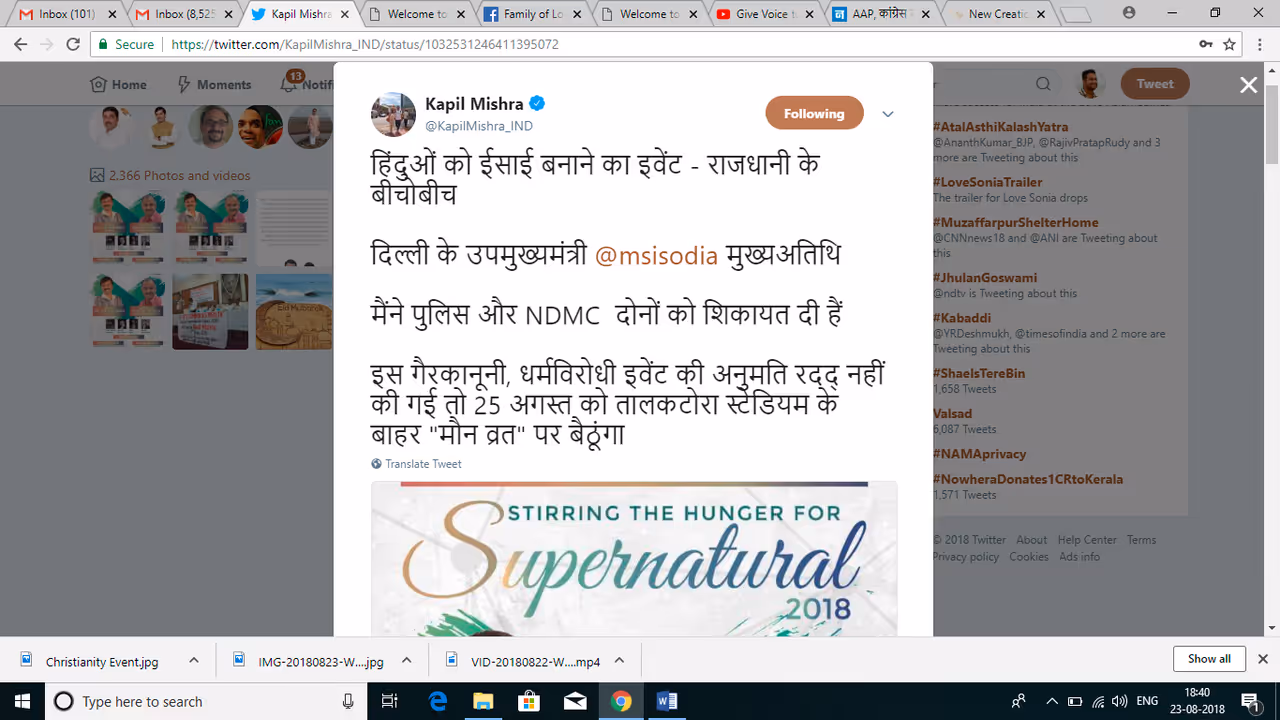 आप के बागी नेता और दिल्ली के पूर्व मंत्री कपिल मिश्रा ने बृहस्पतिवार को एनडीएमसी के चेयरपर्सन नरेश कुमार से मुलाकात कर फैमिली ऑफ लॉर्ड जीसस चर्च (एफओएलजे) के इस कार्यक्रम को दी गई आयोजन की अनुमति रद्द करने का औपचारिक अनुरोध किया। मिश्रा ने ऐसी ही शिकायत दिल्ली पुलिस के समक्ष भी दर्ज कराई है।