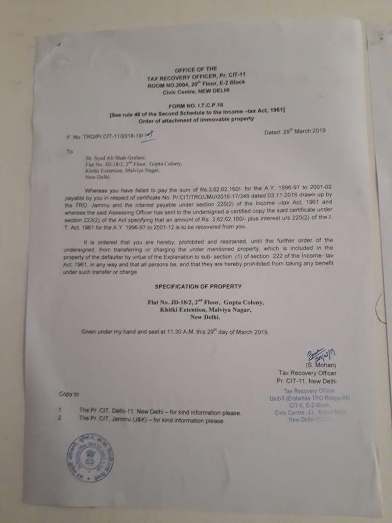 यह कार्रवाई आयकर विभाग ने की है, जिसका गिलानी के उपर 3,62,62,160(तीन करोड़ बासठ लाख बासठ हजार एक सौ साठ) रुपए का बकाया है।