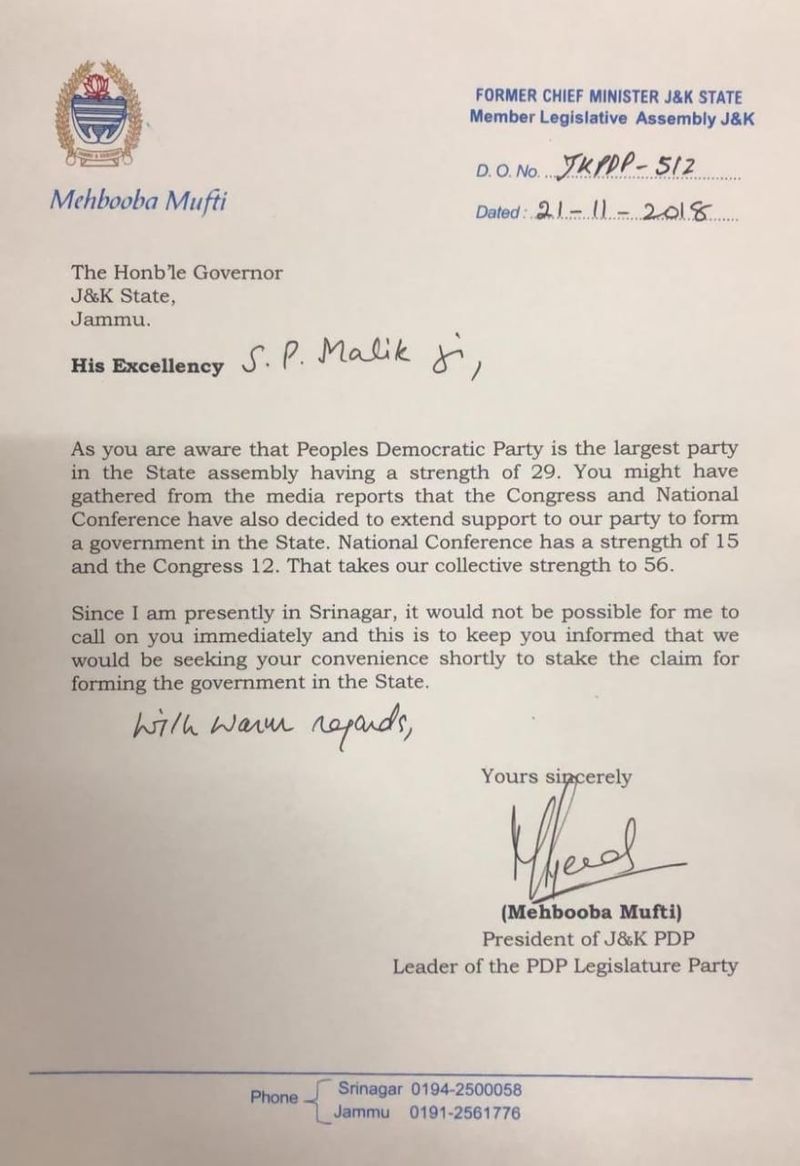 पूर्व मुख्यमंत्री महबूबा मुफ्ती ने देर शाम राज्य में सरकार बनाने का दावा करते हुए कांग्रेस और नेशनल कांफ्रेंस के समर्थन वाला पत्र राज्यपाल को फैक्स किया था।