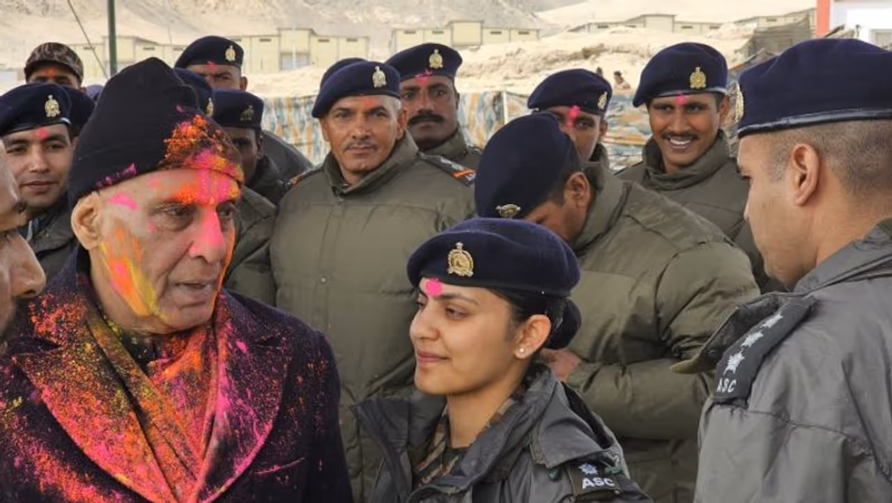 लेह। रंगों के पर्व होली से एक दिन पूर्व देश के रक्षा मंत्री राजनाथ सिंह लद्दाख के लेह में वीर सैनिकों के साथ होली का त्यौहार मनाया। इस दौरान उनके साथ थल सेनाध्यक्ष जनरल मनोज पांडेय और फायर एंड फ्यूरी कोर के जनरल आफिसर कमांडिंग लेफ्टिनेंट जनरल रशिम बाली भी मौजूद थे।