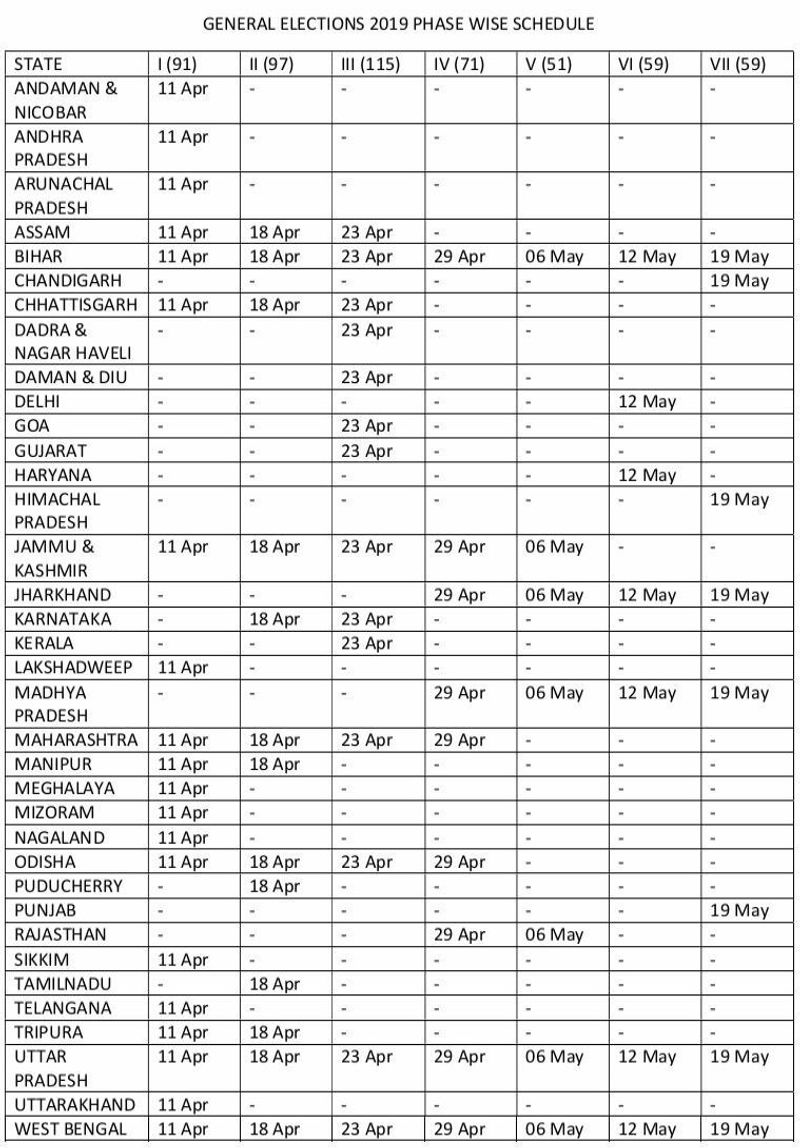 सात चरणों में होंगे चुनाव। 2019 के आम चुनाव में 90 करोड़ लोग अपने मताधिकार का प्रयोग करेंगे। इस बार देश भर में लगभग 10 लाख मतदान केंद्र बनाए जा रहे हैं। सभी ईवीएम को वीवीपैट से जोड़ा जाएगा। इस बार हर ईवीएम पर उम्मीदवार की तस्वीर भी लगी होगी।